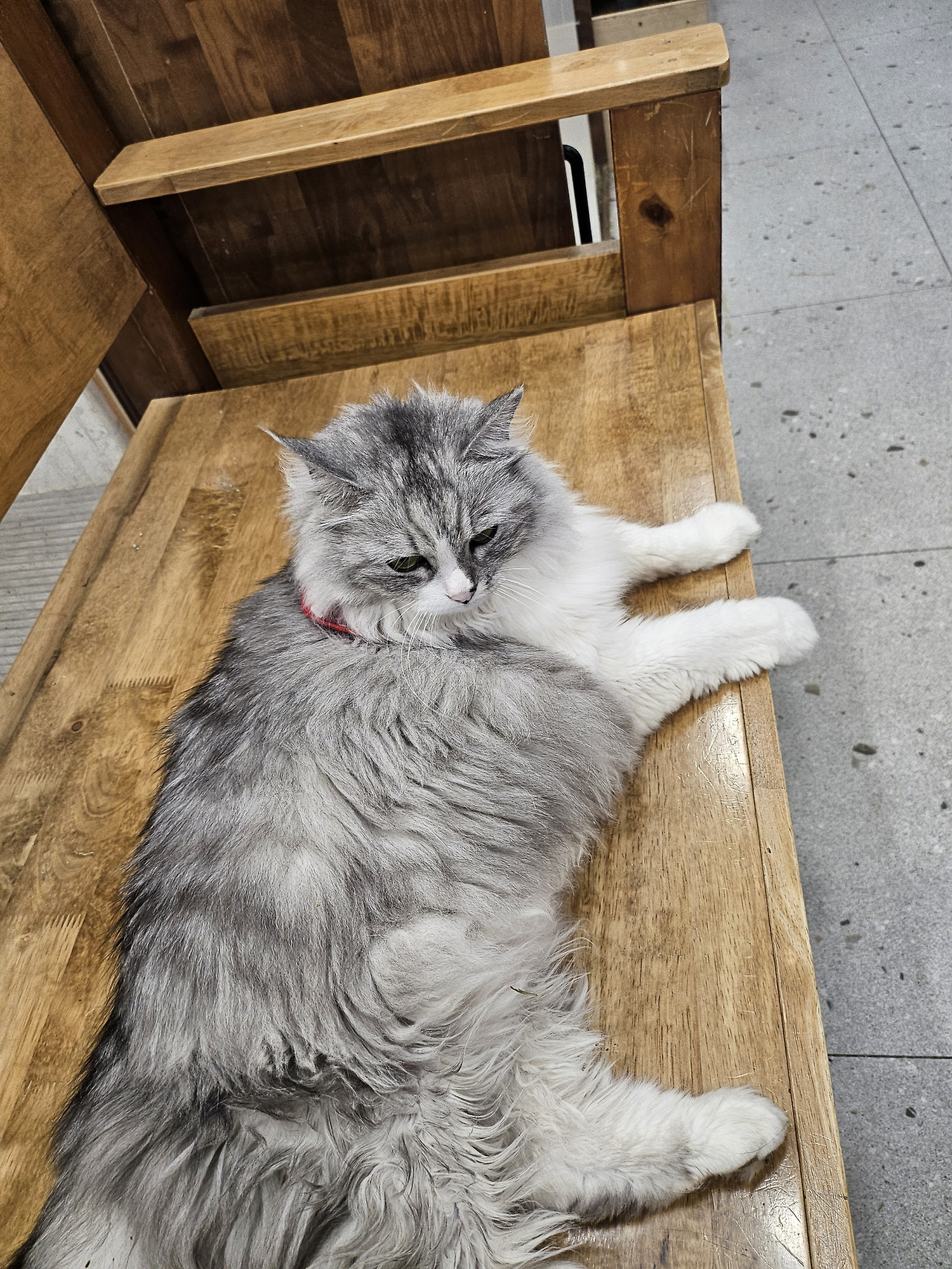 고양이가 편안하게 앉아 있는 모습이 너무 귀여워서 저도 모르게 미소가 지어졌어요.