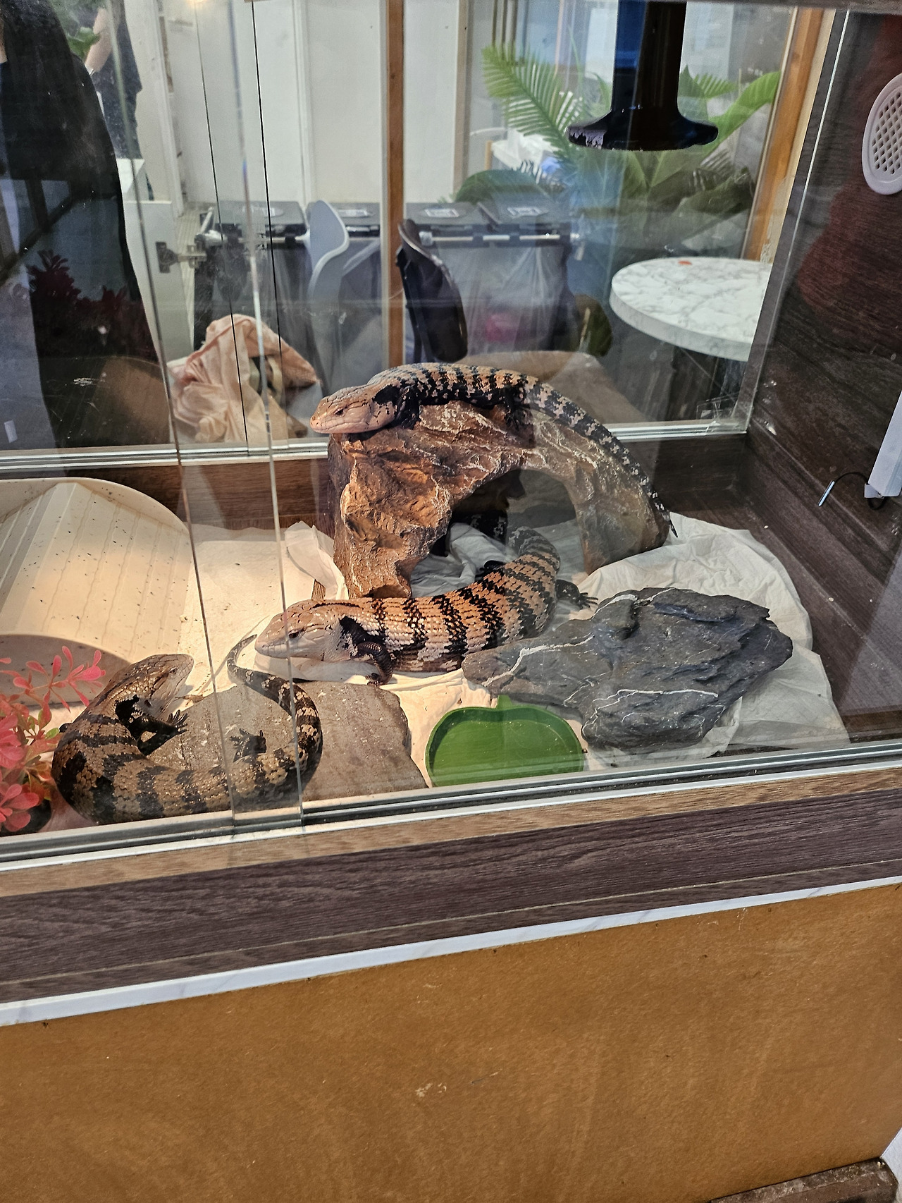 유리 전시장에서 두 마리의 도마뱀을 볼 수 있었는데, 그 모습이 정말 신기했어요.