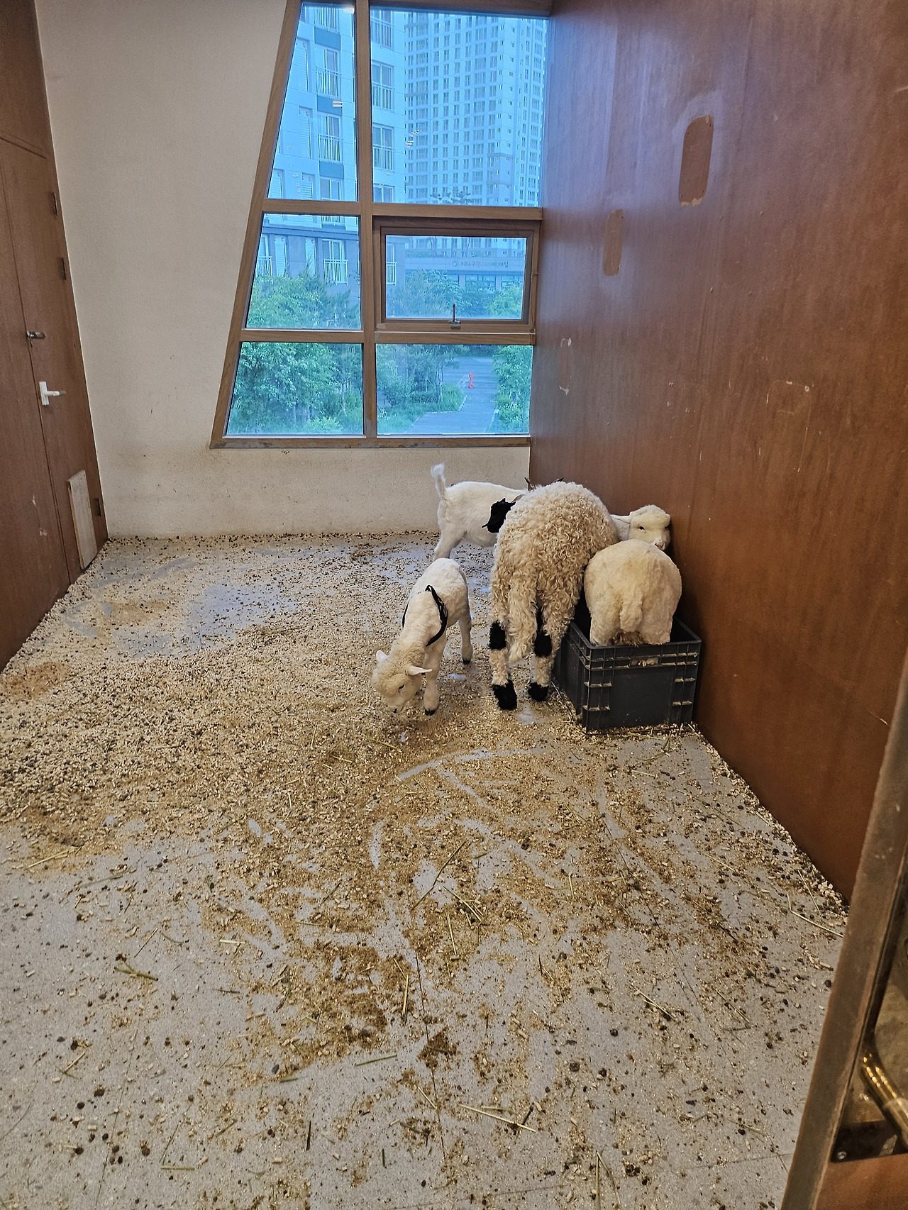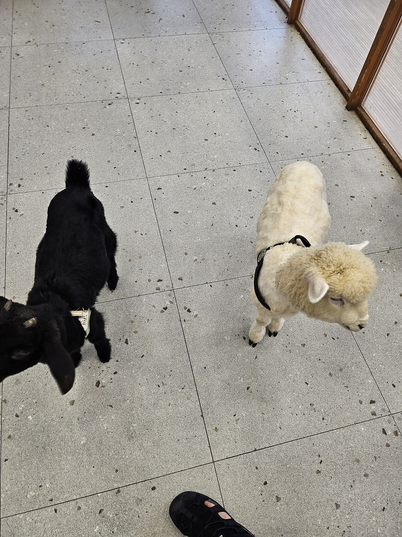 처음으로 만난 동물들은 귀여운 양과 작은 염소였어요.