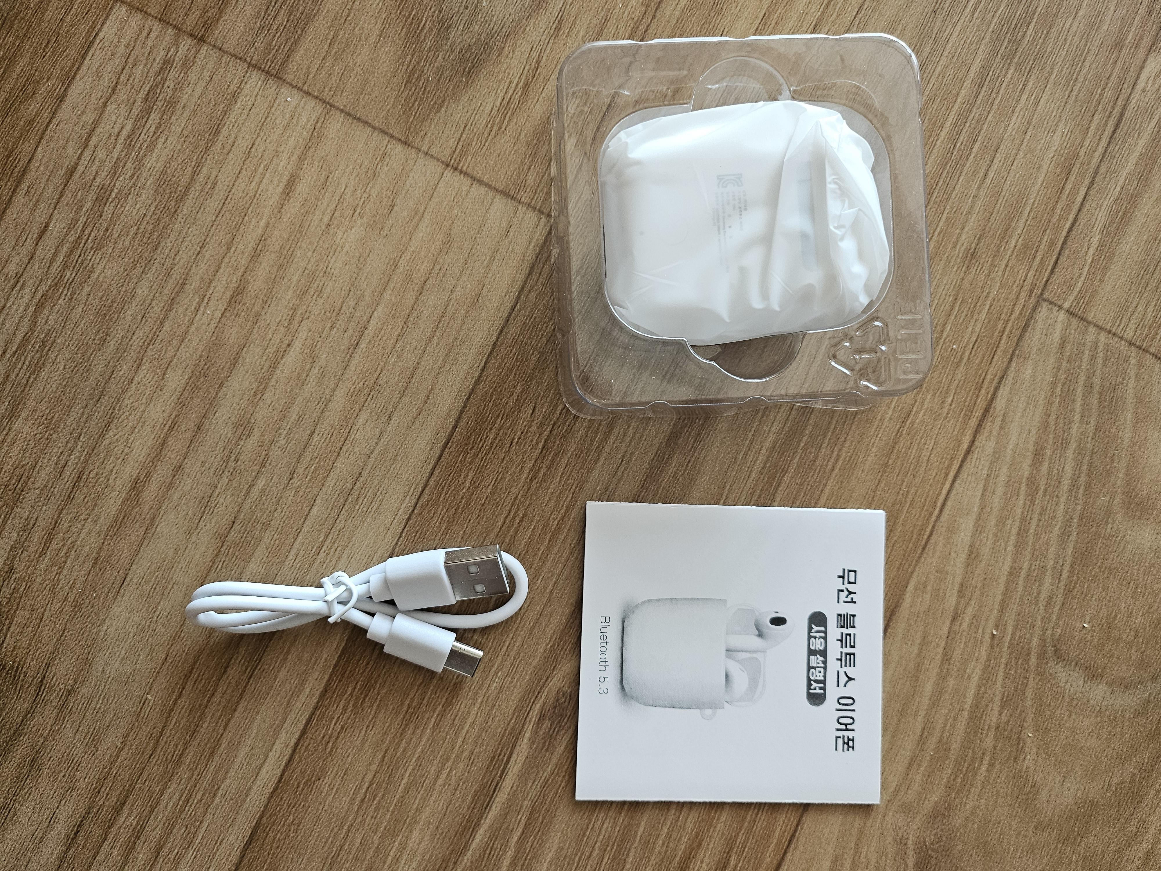 구성품은 이어폰 본체와 충전 케이블 사용설명서가 들어있습니다.