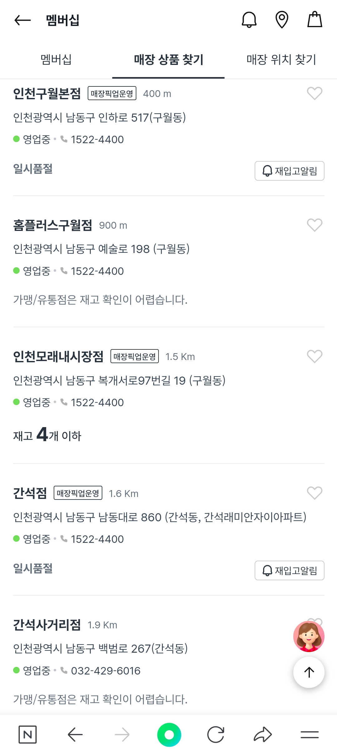 검색을 하면 근처 매장과 재고수량이 나옵니다.