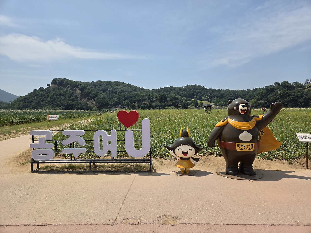 미르섬에 도착하자마자 보이는 "I Love Gongju"라는 큰 간판이 반겨주었어요. 그 옆에 귀여운 캐릭터들도 함께 있어서 사진 찍기 좋은 포인트였답니다. 이곳은 정말로 사랑스러운 분위기가 가득해요.