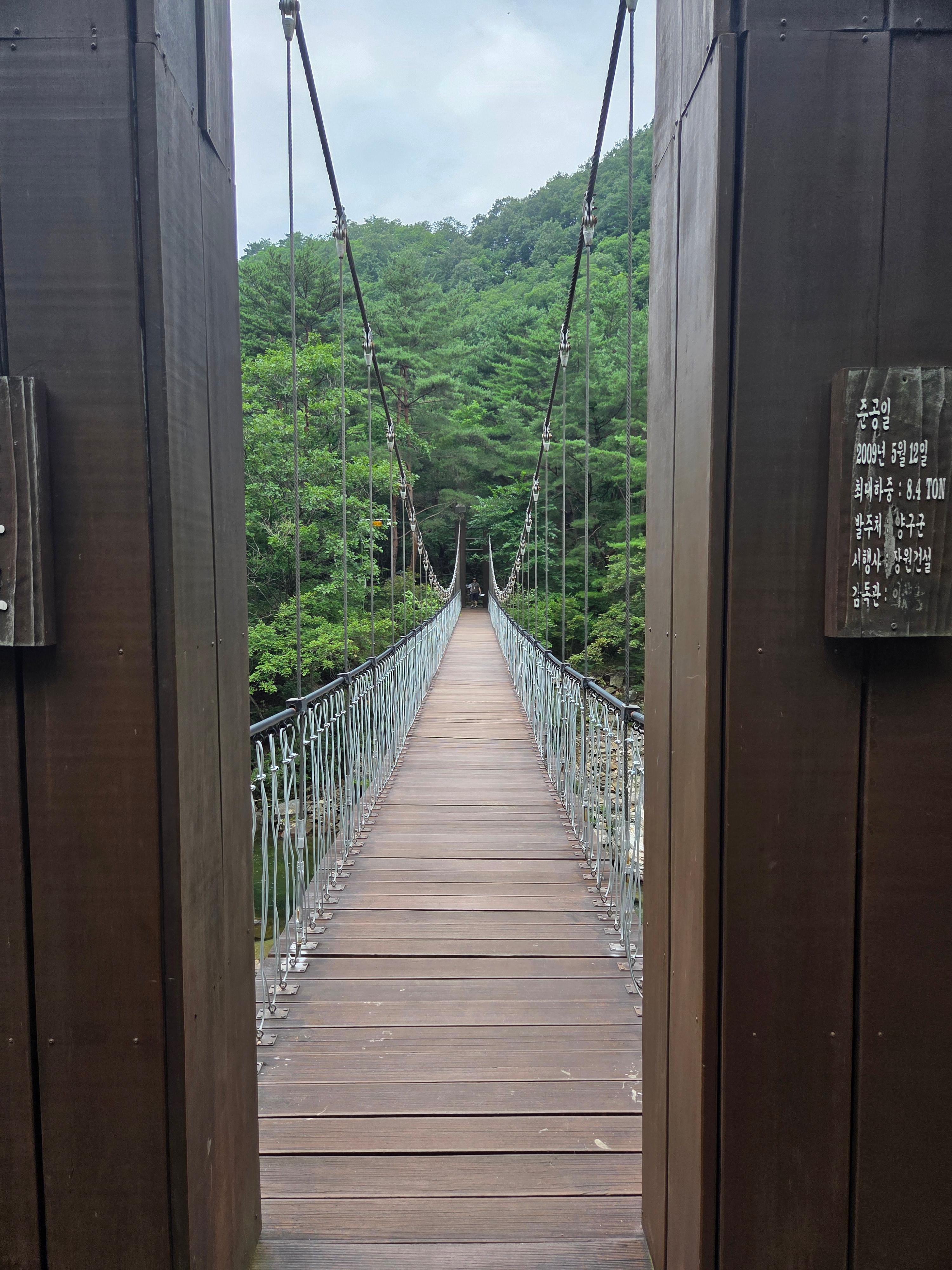 이어서 두타연의 하이라이트 중 하나인 '두타교' 출렁다리를 건너게 됩니다. 계곡 위를 가로지르는 다리를 건널 때마다 느껴지는 아찔한 흔들림은 스릴을 더하며, 다리 위에서는 정면으로 펼쳐지는 두타연 폭포와 주변 기암절벽의 장관을 한눈에 담을 수 있습니다.