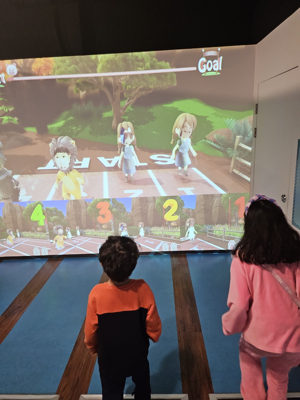 달리기 시합을 하는 곳인데요. 최대 4명까지 할 수 있습니다. 장애물을 피해서 결승선까지 도착하면 됩니다. 동작인식 구역에서 발을 동동 구르면 캐릭터가 달리기를 시작합니다. 여기는 인기가 너무 많아서 줄을 조금 서야 합니다.