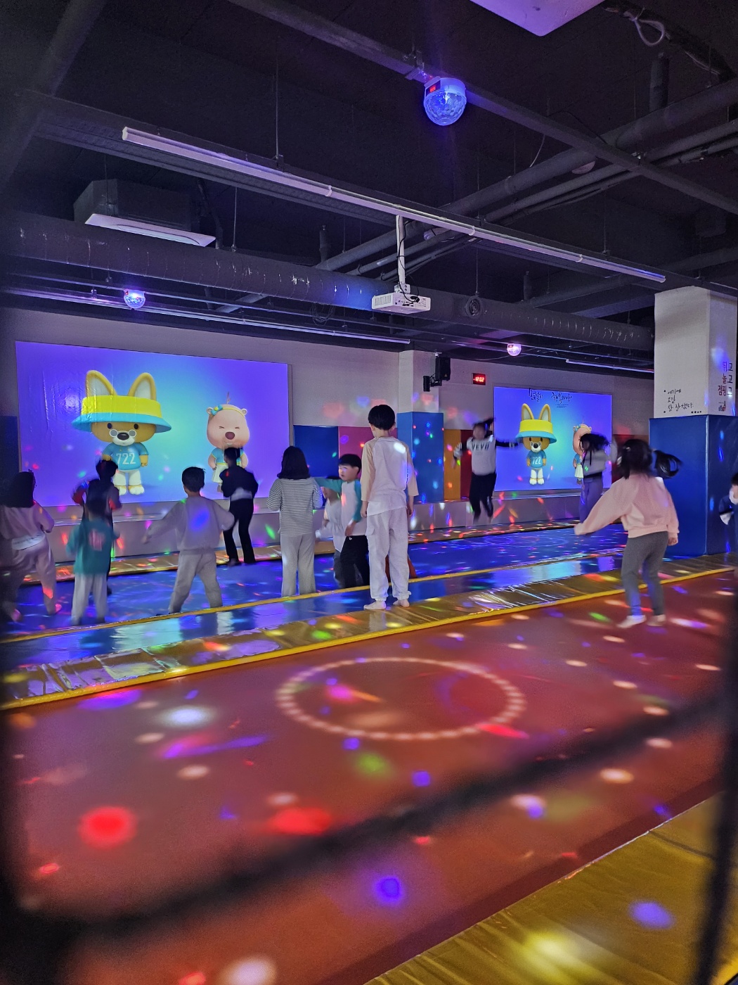 2시간에 한 번씩 댄스타임이 있습니다. 이때 아이들이 다 모여서 방방이 위에서 춤추고 놀아요.
