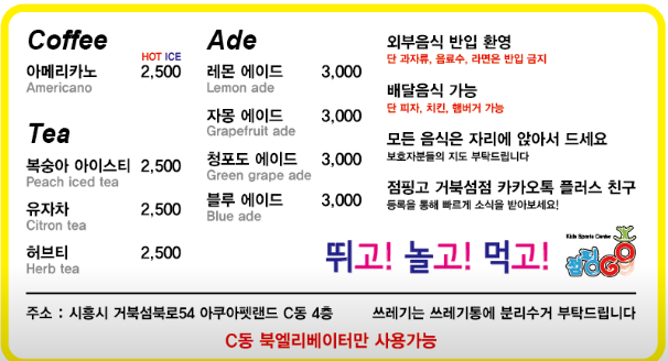 부모들이 쉴 수 있는 공간이 꽤 넓습니다. 테이블은 빈자리 앉으면 되고 방은 예약해야 합니다. 예약이 없으면 현장에서도 대여 가능합니다. 대여료는 시간당 만원입니다.