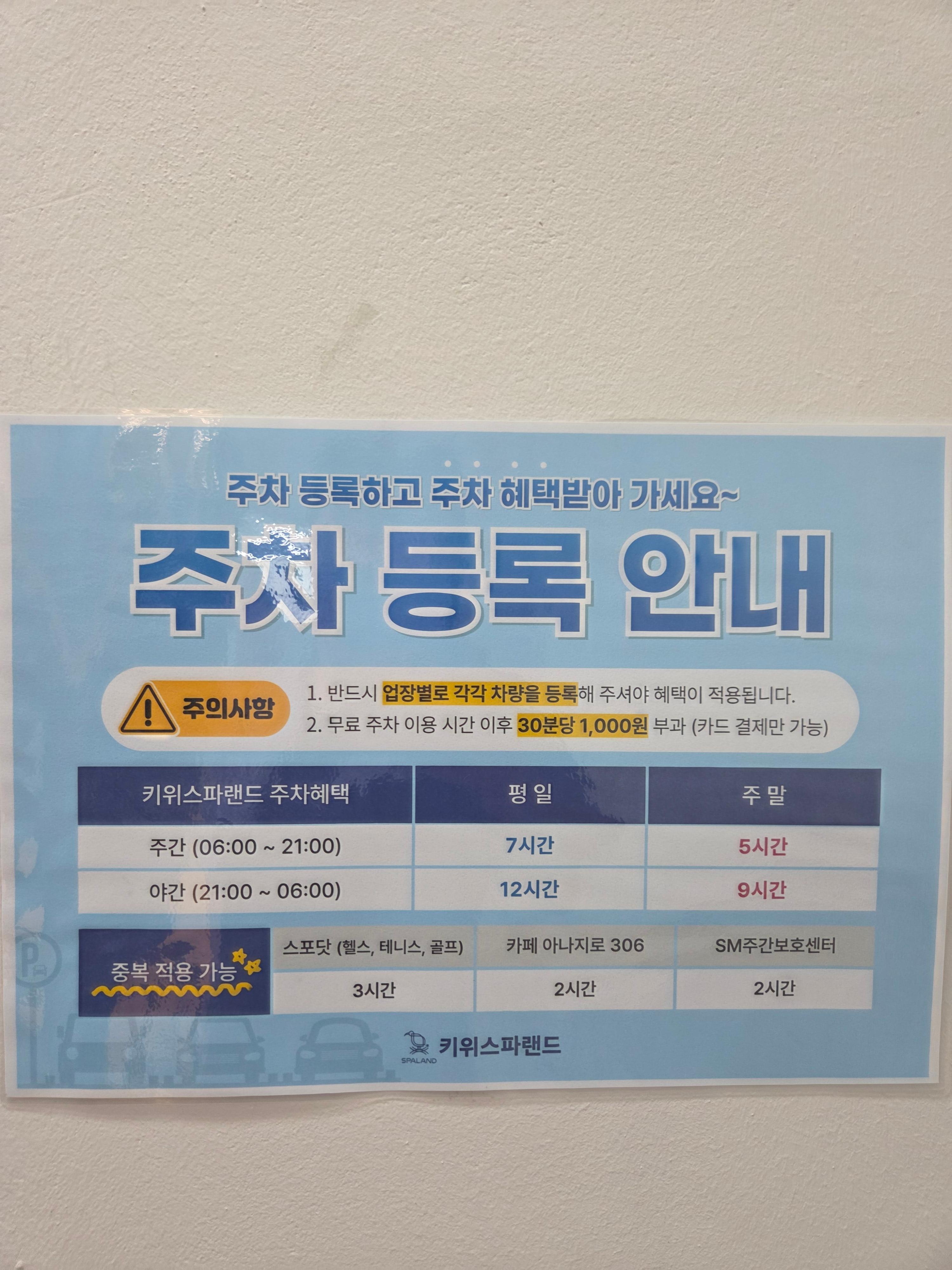 * 주차 시간 확인: 주말/주중, 주간/야간에 따라 무료 주차 시간이 다르니 출차 전 미리 확인하는 것이 좋습니다.